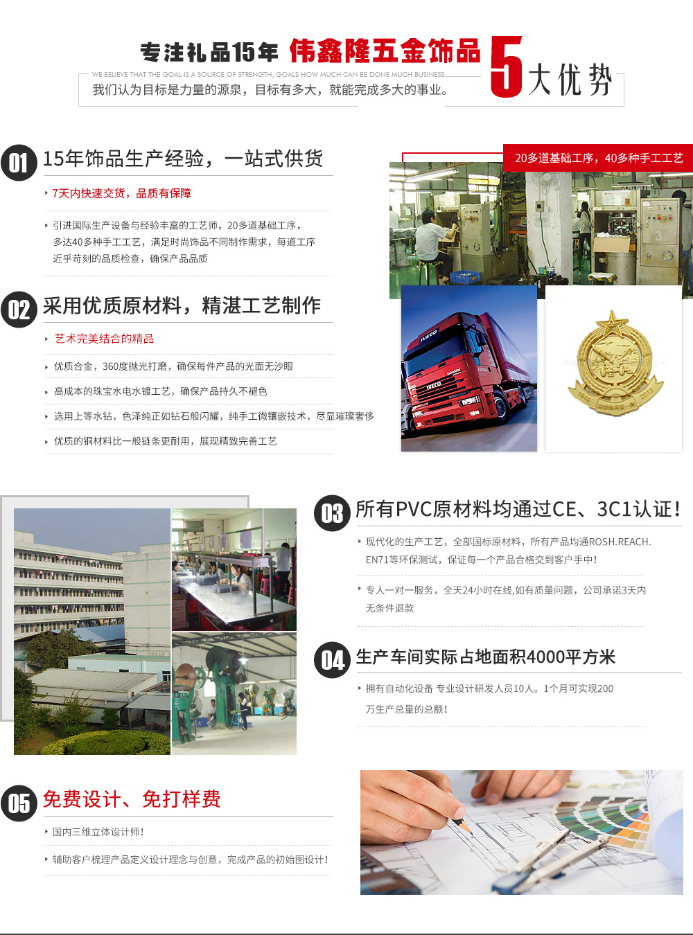 深圳市偉鑫隆五金飾品有限公司位于廣東省深圳市坑梓鎮,是一家集設計、生產、銷售為一體的專業五金禮品工藝公司。 公司擁有經驗豐富的專業技術精英團隊,至今已有十多年設計生產經驗。 公司自有工廠引進先進的臺灣設備及技術,擁有設計、繪圖、制模、沖壓、壓鑄、拋光、電鍍、包裝等生產流程,可生產銅、鐵、不銹鋼、鋁、鋅合金、鉛錫合金等材質的金屬徽章、胸針、胸章、獎章、獎牌、金屬標牌、工號牌、金屬鑰匙扣、狗牌、軍牌、開瓶器、金屬手機吊飾、錢夾、領帶夾、帽夾、項鏈吊墜、掛包鉤、紀念章、紀念幣、袖扣、促銷禮品鑰匙扣、書簽、五金配件、開瓶器等旅游紀念品及工藝禮品五金飾品。我公司還可根據客戶樣板開模生產。 公司秉承“精...